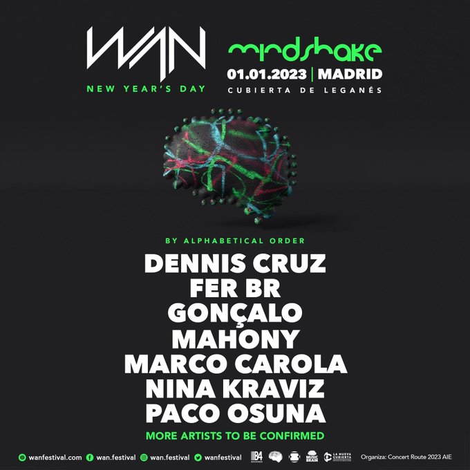 El Año Nuevo volverá a ser recibido de la mejor forma posible gracias al Techno más espectacular. WAN NEW YEAR’S DAY hará que Madrid vuelva a convertirse en la capital del Techno a la hora de dar la bienvenida al 2023 con un cartel diseñado para hacer disfrutar al público. El festival, icónico en la escena en los últimos tiempos, regresará el 1 de Enero a la Cubierta de Leganés de la mano de Mindshake, como así hiciera en la exitosa edición de 2022 (Boris Brejcha, Loco Dice, Michael Bibi, Paco Osuna…).
