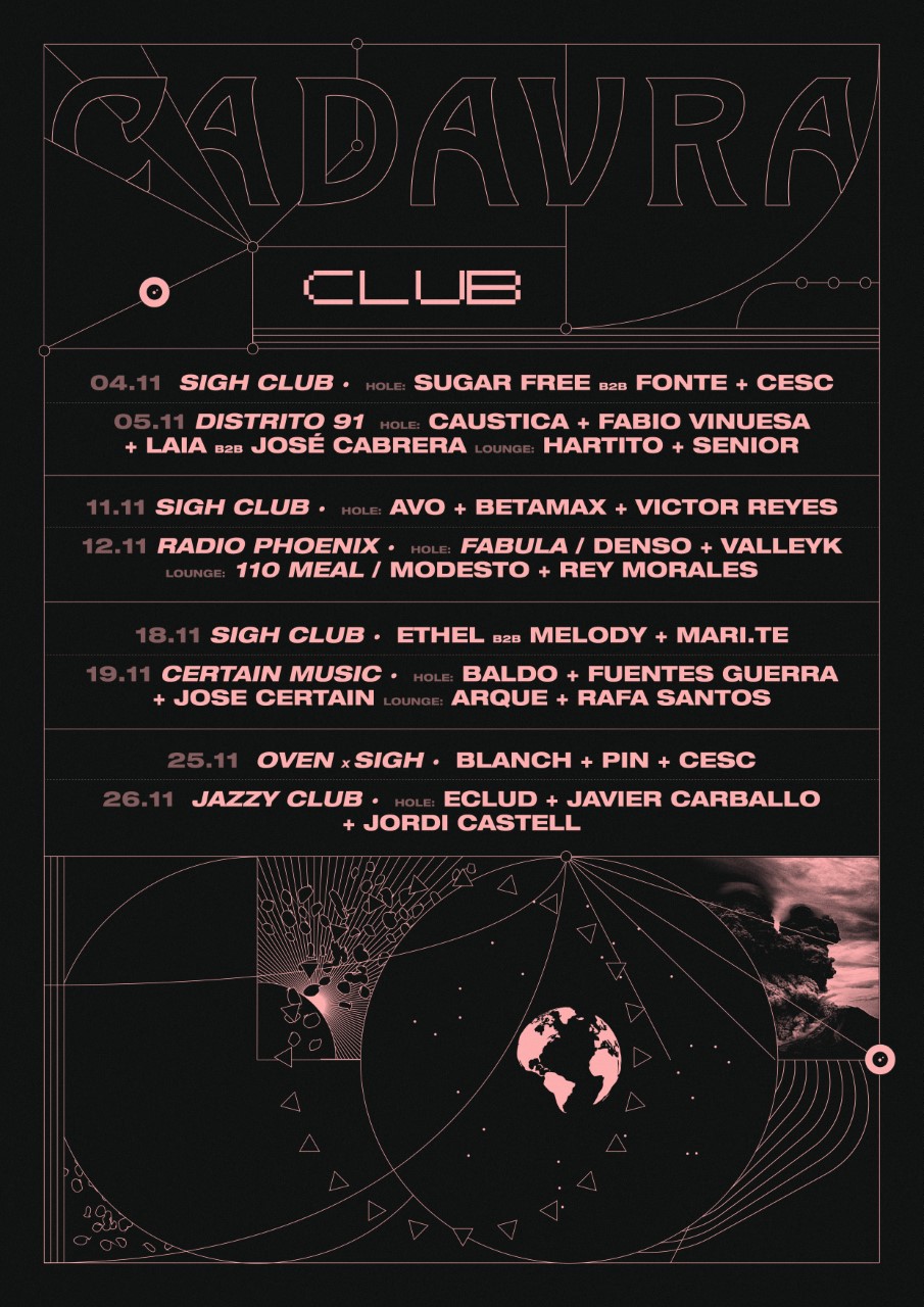 El mes de octubre en Cadavra fue una barbaridad. Visitas como la de Tania Vulcano (Circo Loco), Sedef Adasi (Panorama Bar), Onur Özer o el colectivo Masa Series, dieron forma a una programación estelar en el club madrileño. Para continuar con dicha inercia, el 4 de noviembre, la nueva sesión de Sigh será protagonizada por dos nombres esenciales: Sugar Free regresa junto a Fonte para hacer un b2b. Les apoyará Cesc, que le pondrá picante a una noche inter-nacional. El sábado, se producirá igualmente el regreso a Cadavra del sello Distrito 91. En esa noche de electro y tonos ácidos y oscuros, se podrá disfrutar de sesiones de Fabio Vinuesa, Cáustica y un b2b de Laia en su primera vez en Madrid con José Cabrera; todo ello en The Hole. Hartito y Senior aderezarán el ambiente en la sala superior.