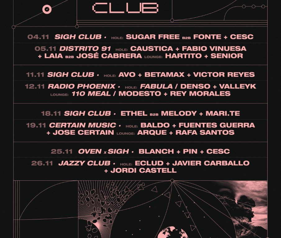 La sala madrileña apuesta por promotores y propuestas nacionales presentes desde su inicio. En el undécimo mes del año vuelven colectivos y agrupaciones locales como Distrito 91, Radio Phoenix y Certain, mientras que Sigh trae DJs y plataformas del ámbito nacional y europeo.