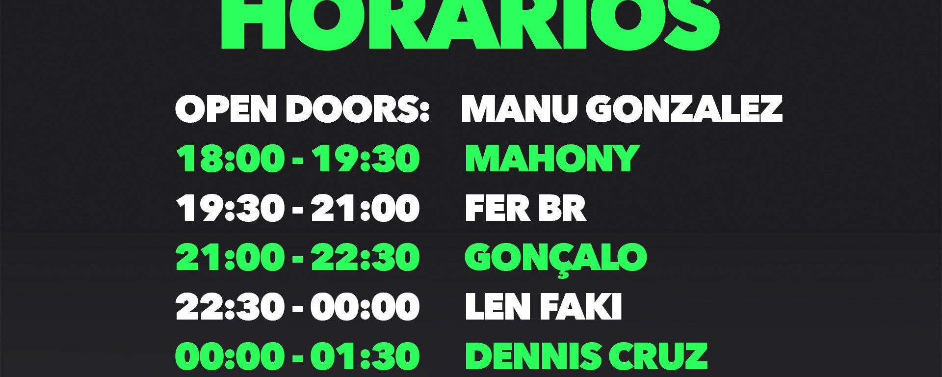 Desde la apertura de puertas (sobre las 17:00 de la tarde) hasta las 06:00 de la madrugada, WAN ofrecerá un frenesí musical con 9 actuaciones musicales de primer nivel: por orden de aparición (podréis ver los horarios exactos más abajo), Manu González, Mahony, Fer BR, Gonçalo, Len Faki, Dennis Cruz, Marco Carola, Paco Osuna y Nina Kraviz. ¡Sin duda, toda una fiesta para celebrar, bailar y disfrutar del mejor ambiente musical!