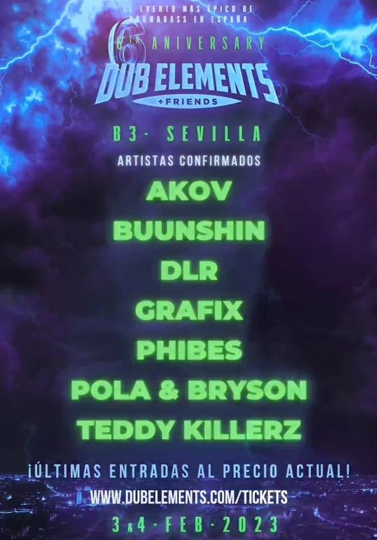 Tras las sensacionales confirmaciones de Grafix y Buunshin, el 6º Aniversario de DUB ELEMENTS & Friends ha seguido cogiendo forma en las últimas semanas. La cita programada para el fin de semana del 3 y 4 de febrero (Sala B3, Dos Hermanas, Sevilla), no sólo sigue añadiendo talento y nombres reconocidos, sino que apuesta por la variedad conformando un LineUp muy atractivo para los aficionados.