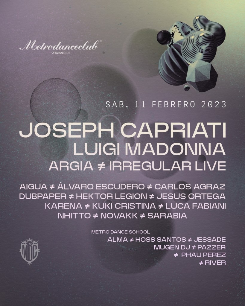 LINEUP 11 FEBRERO 2023 – METRO DANCE CLUB: JOSEPH CAPRIATI + IRREGULAR LIVE + CARLOS AGRAZ + LUCA FABIANI + LUIGI MADONNA + NHITTO + JESÚS ORTEGA + HEKTOR LEGION + KARENA + ARGIA + AIGUA + DUBPAPER + KUKI CRISTINA + ALVARO ESCUDERO + SARABIA + NOVAKK + ALMA + RIVER + HOSS SANTOS + MUGEN DJ + PAZZER + PHAU PEREZ + JESSADE