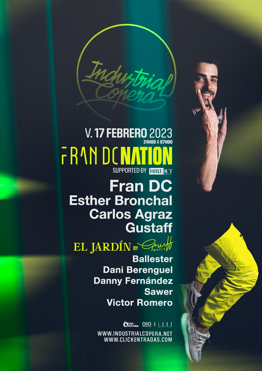 Programada para el viernes 17 de Febrero, la fiesta FRAN DC NATION hará que el sonido más ritmoso del House (con influencia del Techno), acompañe durante una velada muy especial donde también estarán ESTHER BRONCHAL, CARLOS AGRAZ y GUSTAFF, representando de ese modo lo mejor de la marca HireOut Mgmt, agencia impulsada por el propio Fran.