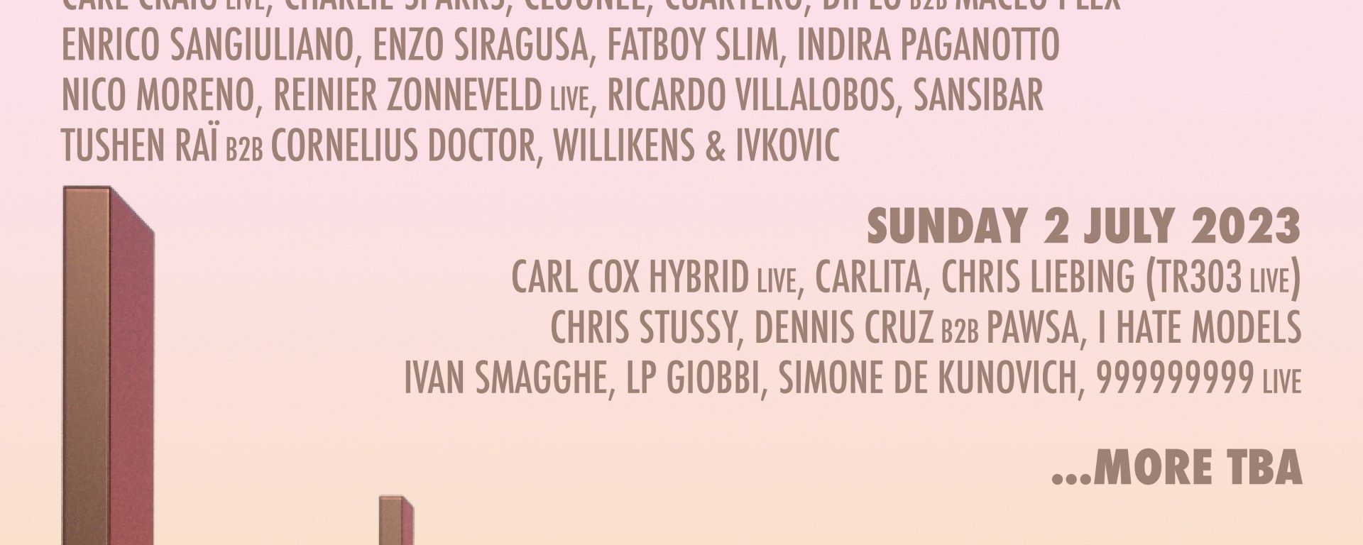 En la extensión del LineUp ya ofrecido, podemos resaltar grandes nombres clásicos de la electrónica mundial como RICARDO VILLALOBOS, CARL COX HYBRID (Live), BLACK COFFEE, CARL CRAIG (Live), AFTERLIFE presented by TALE OF US, FATBOY SLIM o CHRIS LIEBING (TR303 Live), haciendo que sonidos muy variados (Techno, Deep House, Melodic Techno, Tech, Hard Techno…) reluzcan con esencias clásicas y vanguardistas fusionados como sólo pueden hacer genios de tal altura.