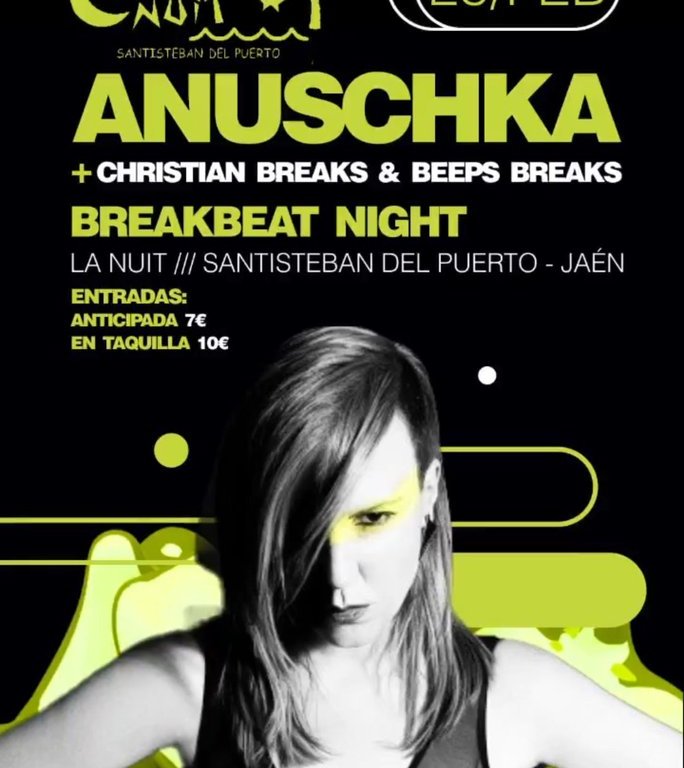 El breakbeat levanta pasiones allá donde va, siendo muy seguido en Andalucía y en este caso, en la provincia de Jaén. Gracias a esta cita, los aficionados de la provincia podrán disfrutar de una fantástica y cañera velada donde Anuschka volverá a demostrar su talento sinigual con la música. ¿Quién se apunta a esta Breakbeat Night? Entradas en este enlace.