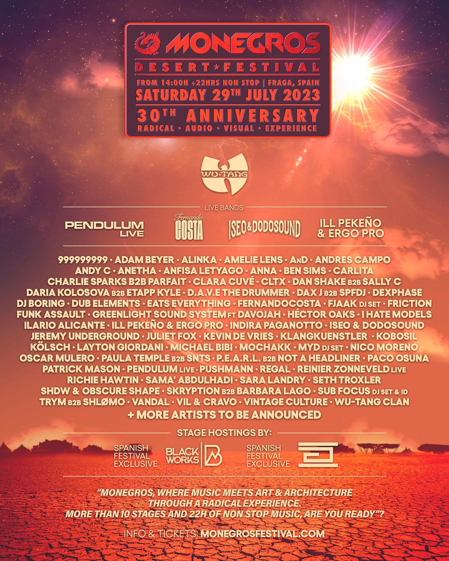 Tras el éxito de su ansiado regreso el pasado verano, MONEGROS DESERT FESTIVAL ha comenzado a desvelar los detalles de su próxima edición. El festival aragonés, que celebrará su 30º Aniversario el sábado 29 de julio, ha presentado a los primeros artistas confirmados para una edición muy especial que promete dar grandes sorpresas a los aficionados, como así revela el brutal LineUp que ha sido anunciado en los últimos días. Con predominio del Techno y variados, pero añadiendo el toque de otros estilos como el Drum And Bass o el Urban, Monegros vuelve a postularse como una de las mayores apuestas musicales del año en España.