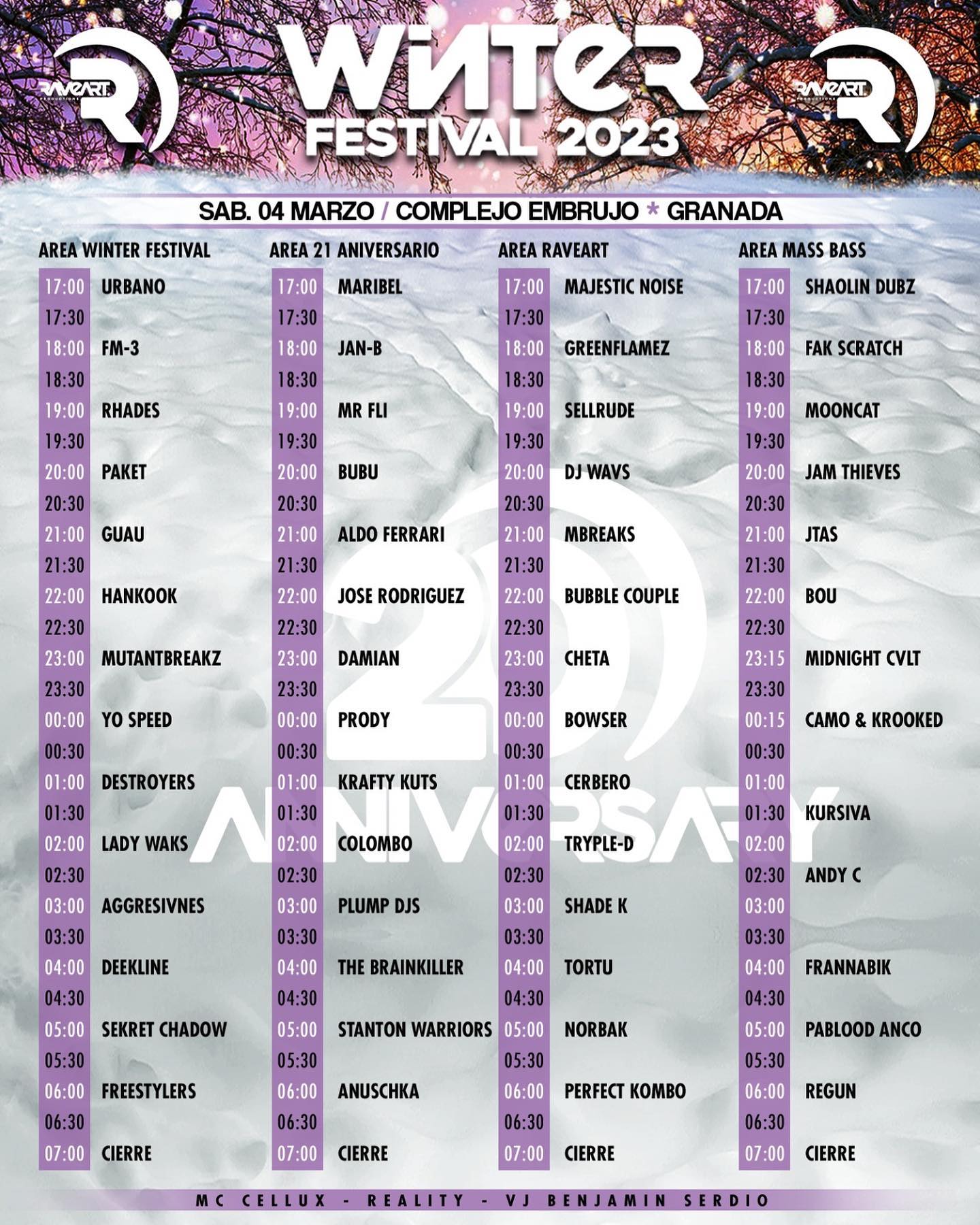 Convertido en un clásico de estas fechas, WINTER FESTIVAL, promovido e impulsado por la marca española RAVEART, volverá a juntar lo mejor del Breaks y del DNB en una fantástica jornada musical. De 17:00 de la tarde a 07:00 de la mañana de este sábado (4 Marzo), el Complejo Embrujo de Granada se viste de gala para recibir a aficionados dispuestos a darlo todo en el 20ª Aniversario de la marca. Con una propuesta muy seria cuidada al detalle, el festival contará con 4 escenarios donde se desatará la locura musical a lo largo de toda la tarde y la velada.