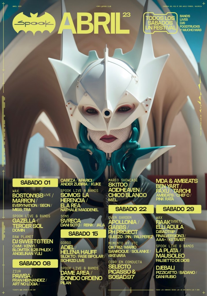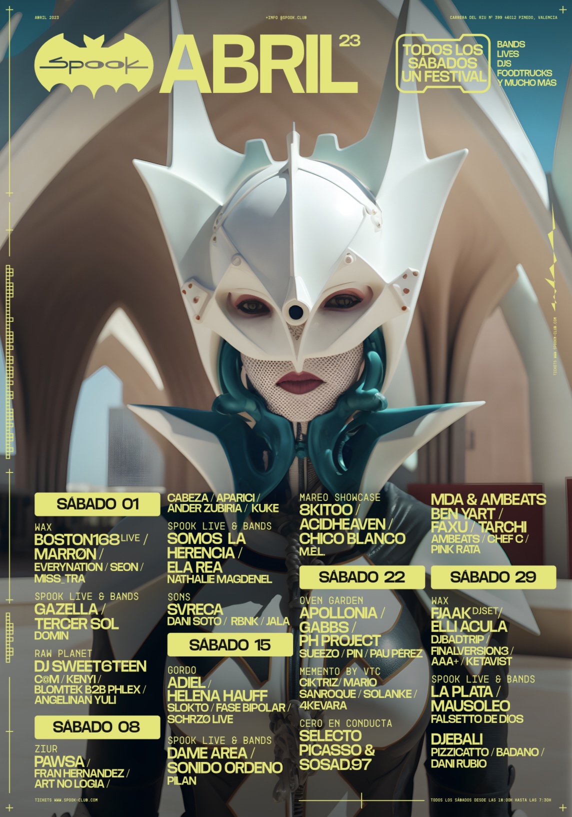 Como se precisaba anteriormente, abril es visto con ilusión gracias a la apuesta que ofrece Spook. En esa programación destacarán las visitas de estrellas internacionales como Adiel, Helena Hauff, Boston168 Live, Fjaak, Dame Área o Apollonia; la presencia de instituciones y marcas nacionales de primer nivel como Club Gordo, SONS, Mel, Ziur, Raw Planet, Cero en Conducta, Mareo, Oven y Wax; así como la infalible permanencia de los residentes Finalversion3, DJ Badtrip, Seon y Everynation.