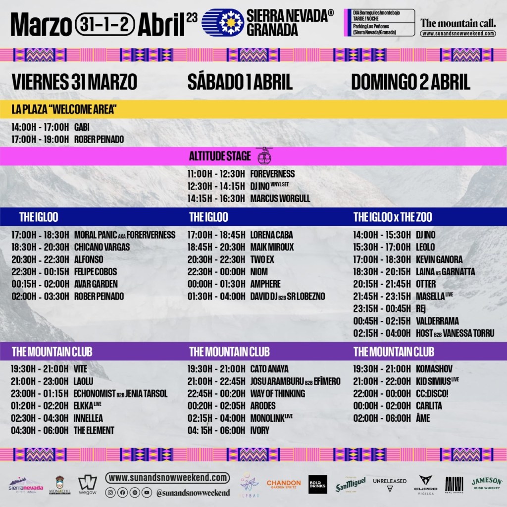 Este fin de semana llega al fin la puesta en marcha de la cuarta edición de Sun & Snow Weekend. Desde el viernes hasta el domingo (31 Marzo-2 Abril), Sierra Nevada acogerá lo mejor de la electrónica en sonidos como el Techno, Experimental, IDM, Melodic Techno, Deep House, etc., ofreciendo una combinación sensacional entre música en vivo y la alta montaña del entorno de la serranía granaína.