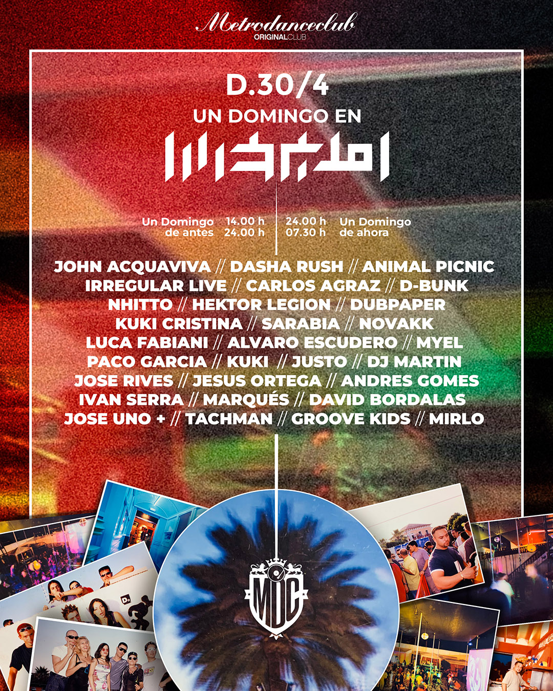 METRO DANCE CLUB sigue impulsando la escena con su propia apuesta personal por la música de baile. El club alicantino sigue dando que hablar en la escena clubbing gracias al estreno de su nuevo concepto, el cual respeta su formato y forma musical pero aflorando un aire novedoso al hacer hincapié en un viaje musical a través del tiempo. UN DOMINGO EN METRO propone un viaje por la historia de la electrónica que partirá de la esencia de los ritmos pioneros hasta desembarcar en la vanguardia más puntera y pegadiza.