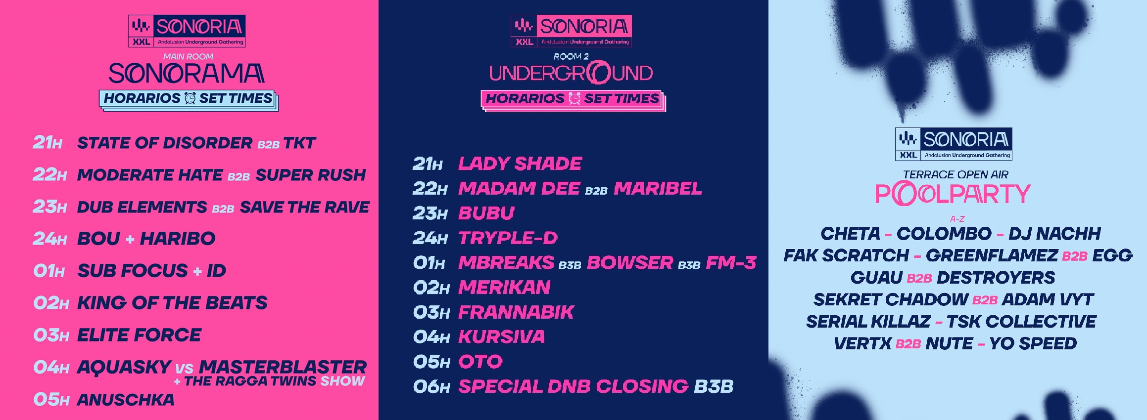 A lo largo de 3 escenarios (pool party incluida) el festival potenciará el sonido Bass en una fabulosa concentración de talento que acaparará todas las miradas durante la jornada del sábado. El festival pretende crear solera a nivel nacional, causando un impacto directo en la escena Andaluza y repercutiendo con creces más allá de nuestras fronteras. ¡Ojalá que sea una edición muy exitosa! Descubre ya el cartel completo y horarios de actuaciones: