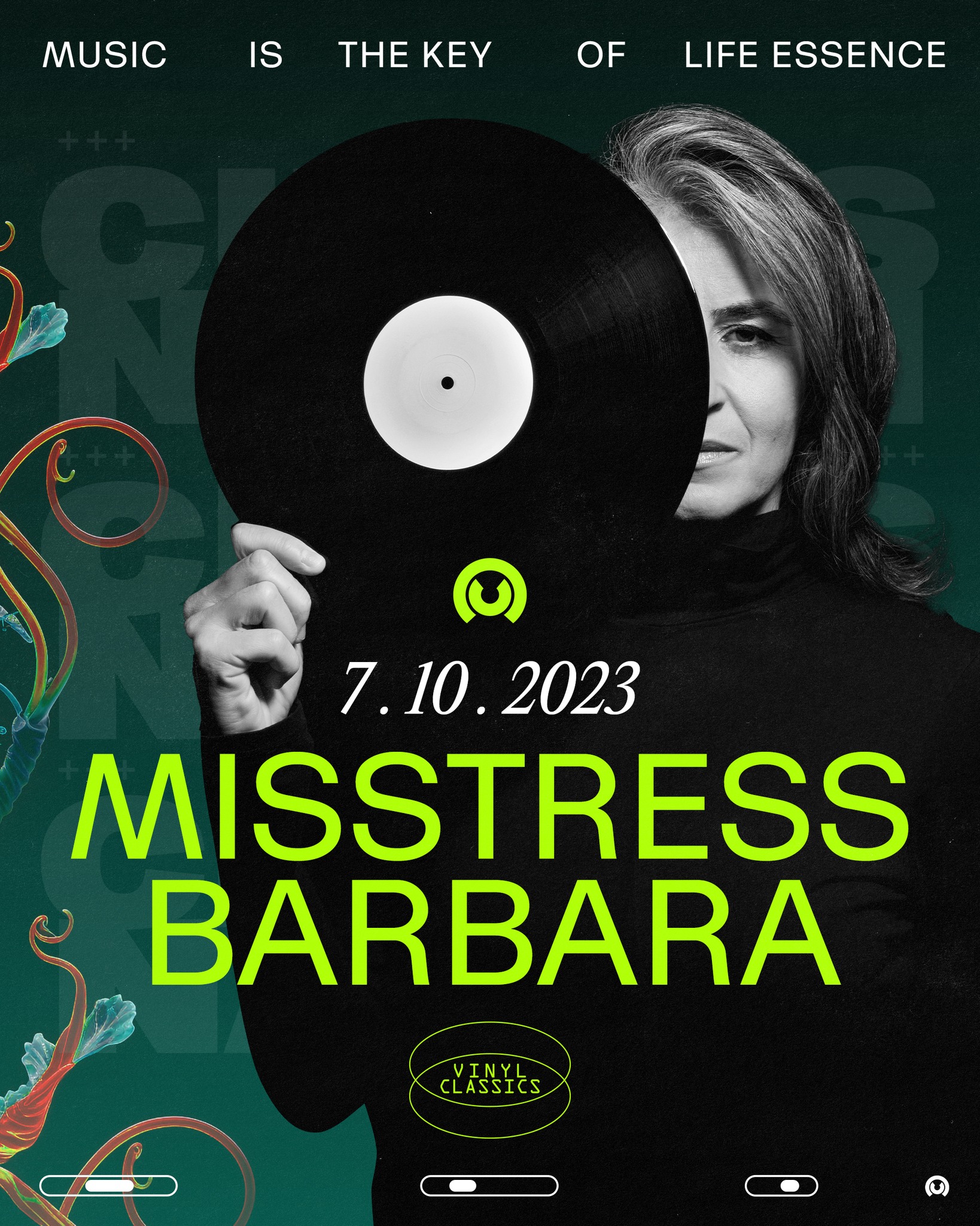 La italo-canadiense MISSTRESS BARBARA es la primera dj confirmada de cara a esta nueva edición. Siendo toda una leyenda de la escena Underground, la dj y productora hará disfrutar al público de ese sonido Techno muy especial y selecto, alzando su irresistible Hard Beat de esencias House hasta las cotas más elevadas. Además, su actuación será a vinilo, algo que reivindicará el festival ofreciendo un escenario (Vinyl Classics) con actuaciones exclusivas a los platos y donde estará la diva del Techno.