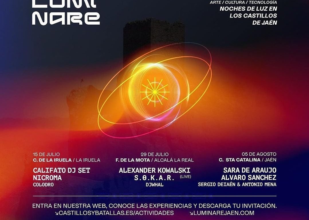 LUMINARE es sin duda una de las grandes iniciativas musicales del presente verano. 3 fechas con 3 veladas llenas de electrónica y 3 castillos llenos de magia en la provincia de Jaén, dan forma a un proyecto destinado a invadir con la mejor electrónica estos enclaves de la provincia andaluza. La Iruela (15 de Julio), Alcalá La Real (29 de Julio) y Jaén (5 de agosto) son las localidades que acogerán una oferta de arte, cultura y tecnología en lo que se ha denominado como las Noches de Luz en Los Castillos de Jaén.
