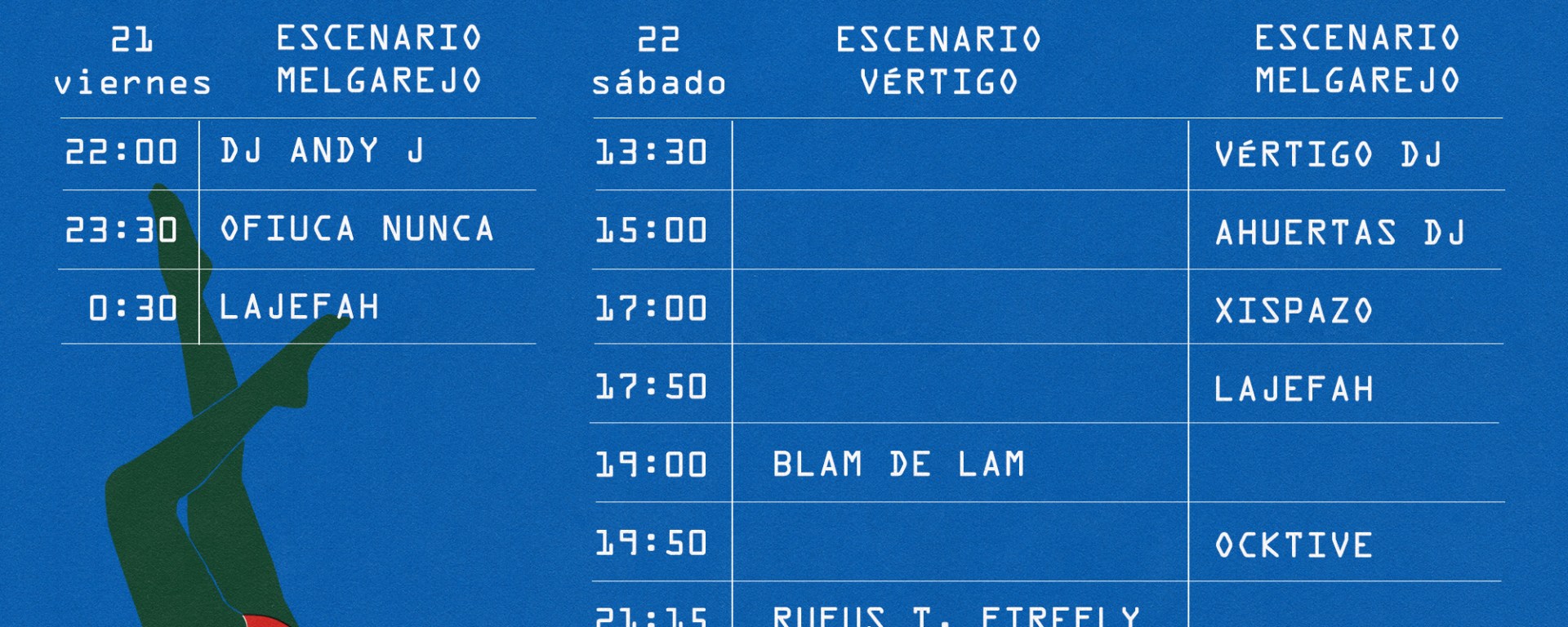 Con una fiesta inaugural gratuita en la jornada del viernes y con el máximo despliegue del potencial el sábado, el festival contará con sonidos como el Rock, Indie y electrónica gracias a actuaciones diversas como las de Rufus T. Firefly, Niña Polaca, Banin (Dj Set), Xispazo o Ciervoss. Así mismo, nosotros volveremos a estar presentes gracias a la actuación de nuestro residente AHUERTAS, quien hará bailar al público de 15:00 a 17:00 con un Dj Set muy especial (House, Disco, Funky...) en el escenario Malgarejo del sábado.