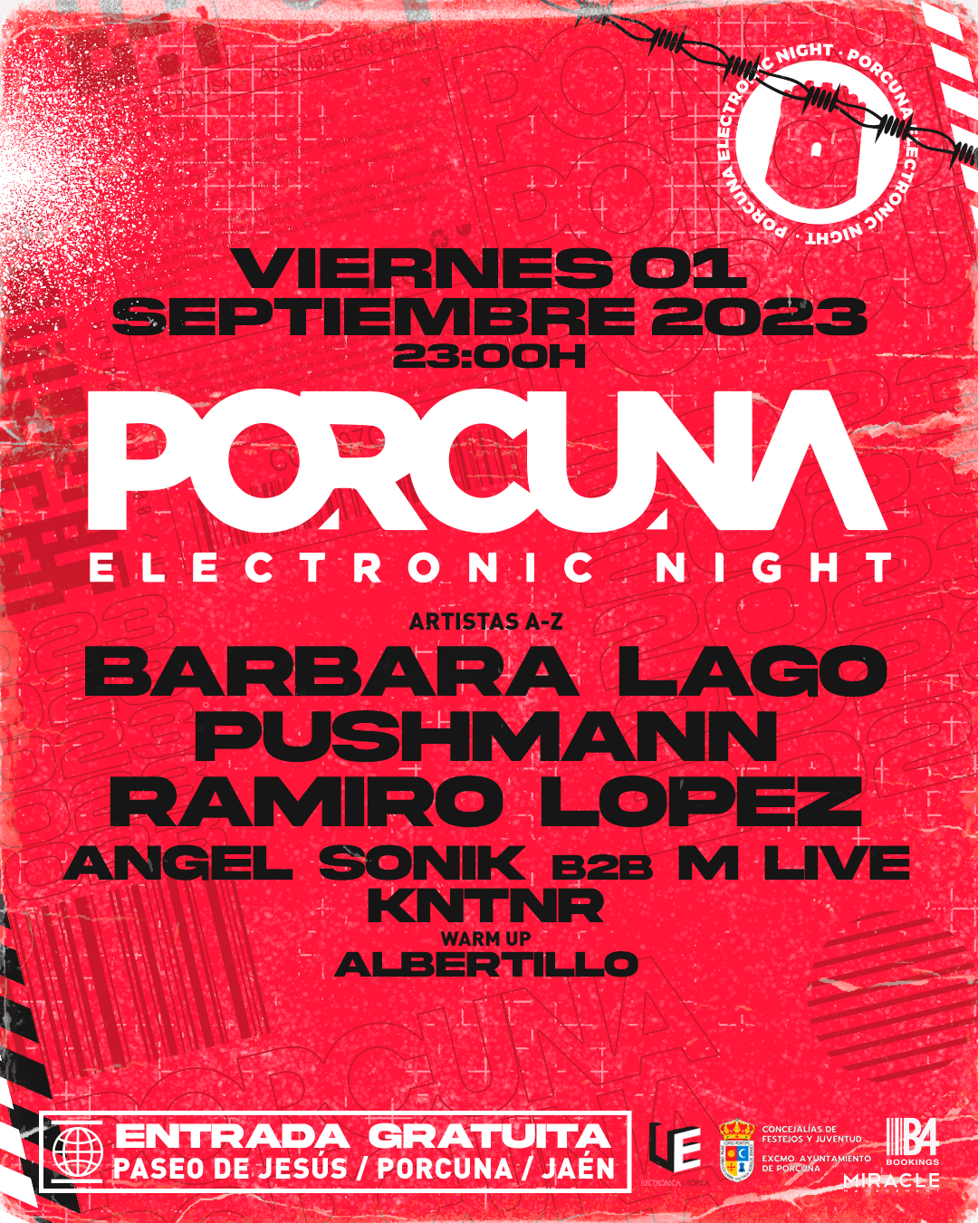 El jiennense PORCUNA ELECTRONIC NIGHT ha sorprendido en estas últimas jornadas presentando a los artistas que harán disfrutar al público en su nueva edición. El festival gratuito (!!) de la provincia de Jaén se citará el viernes 1 de septiembre en el Paseo de Jesús de Porcuna, ofreciendo un energético ritmo Techno donde estarán presentes varios referentes nacionales y lo mejor de la escena local.