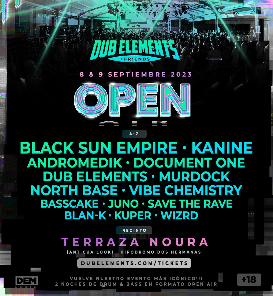 El mes de septiembre llega con grandes noticias para los amantes del Drum And Bass en España. Los días 8 y 9 de septiembre la locura será desatada en Sevilla gracias a la edición OPEN AIR del evento DUB ELEMENTS & FRIENDS. La Terraza Noura (antigua Look) en el Hipódromo de Dos Hermanas será testigo de la locura que desatará el dúo sevillano junto a la fantástica ristra de artistas invitados para sendas veladas.