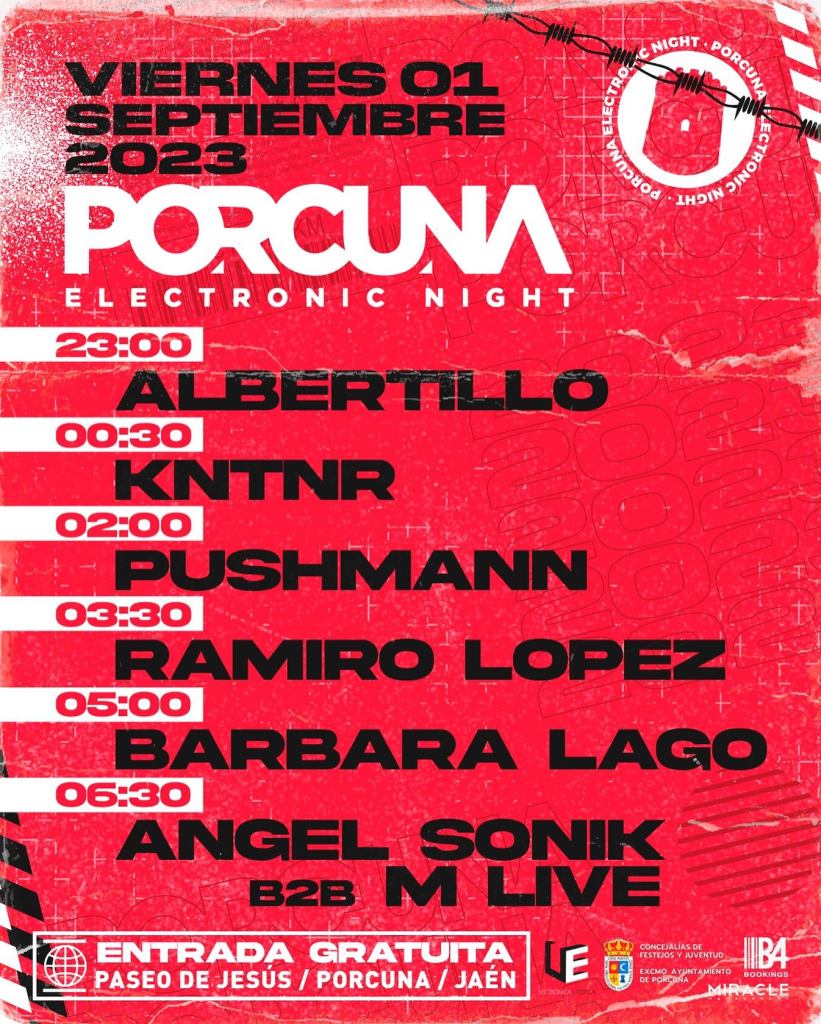 A partir de las 23:00, el festival vivirá una explosión sonora gracias a las actuaciones, de forma cronológica de Albertillo, KNTNR, Pushmann, Ramiro López, Bárbara Lago y Ángel Sonik b2b M Live quienes harán vibrar al público en lo que promete ser una edición para el recuerdo. ¿Y tú? ¿Estás preparado para disfrutar del mejor Techno en Porcuna? Estás a tiempo de apuntarte a uno de los mejores festivales gratuitos del sur del país!