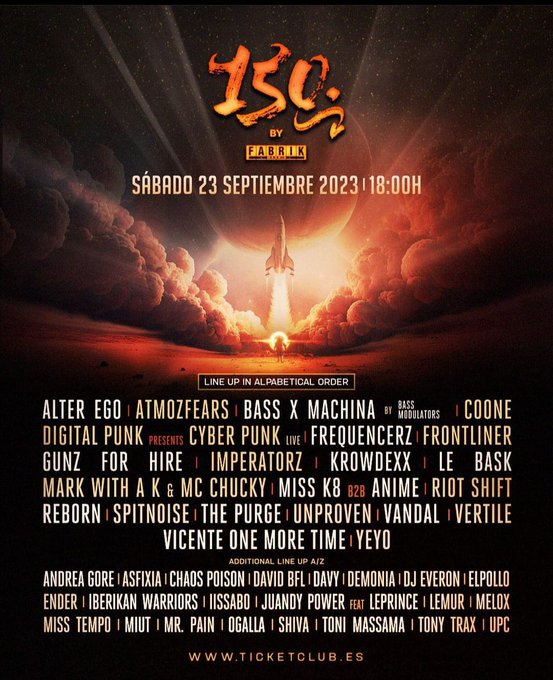 El sábado 23 de septiembre dará inicio la nueva temporada de 150 en una cita que contará con referentes internacionales de la talla de COONE, FRONTLINER, BASS MODULATORS (presentando BASS X MACHINA), ATMOZFEARS o VERTILE en sonidos melódicos y Euphoric Hardstyle; GUNZ FOR HIRE, FREQUENCERZ, DIGITAL PUNK y su Live CYBER PUNK o MISS K8 b2b ANIME en las atmósferas Rawstyle y casi Hardcore; así como MARK WITH A K, THE PURGE, SPITNOISE o VANDAL, en el sonido Rave y Uptempo más alocado.