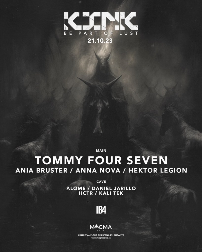 Los creadores y residentes de KINK Social Club son los DJs y productores Hektor Legion y Anna Nova, dos apasionados de la música electrónica que ponen a disposición de este proyecto todo su talento y experiencia. El próximo capítulo de KINK Social Club será el próximo 21 de octubre en Sala Magma dando un paso más en su propuesta, añadiendo a su line up a una figura internacional destacada como Tommy Four Seven. Figura emblemática del techno británico, ha forjado un legado de casi dos décadas en la escena internacional. Selecto productor, es conocido por su habilidad para cautivar con una paleta sonora dinámica y ritmos envolventes. Su sello 47 es un faro de innovación en el mundo del techno contemporáneo. Con su visión elegante, sofisticada y su oído agudo, hará adentrarte en un viaje musical a la vanguardia de la escena.