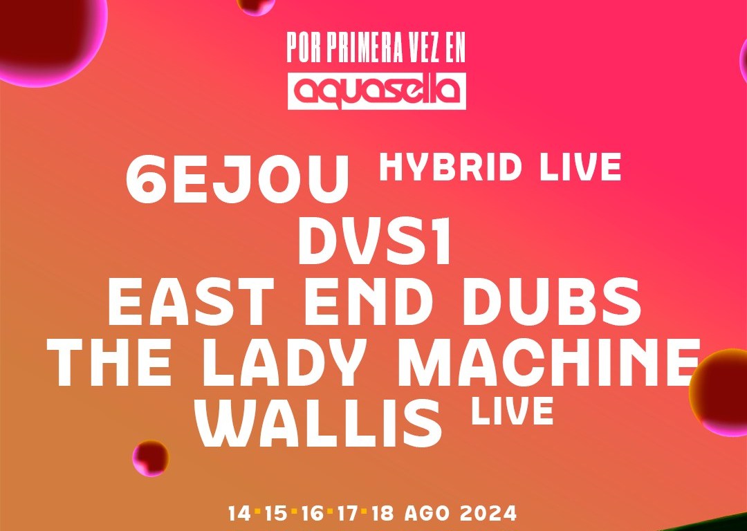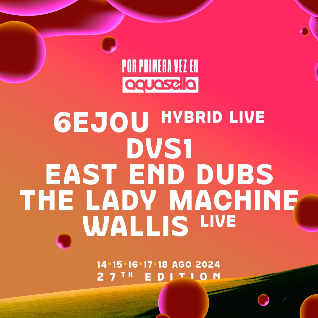 Apostando por la variedad y la innovación, Aquasella ha presentado un primer avance conformado por artistas que nunca han estado en el festival. Así es como el Hypnotic Industrial Techno del francés 6EJOU, el Techno contundente de corte clásico del estadounidense DVS1, el House británico de EAST END DUBS, el aroma Underground-Rave berlinés de la brasileña THE LADY MACHINE, y la elegancia del francés WALLIS expuesta en un Live con synthes orgánicos y modulares, debutarán en el festival español ofreciendo magia, ritmo y mucho baile.
