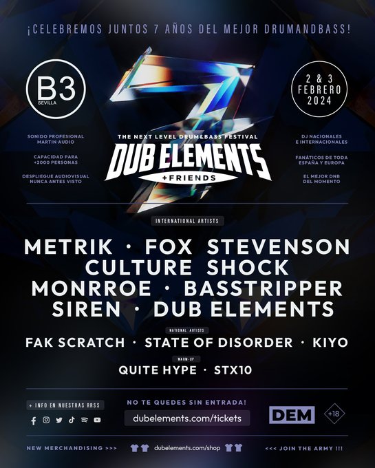 Tras unas semanas vibrantes gracias a los anuncios de Metrik, Culture Shock y Fox Stevenson, la nueva cita de DUB ELEMENTS & FRIENDS ya puede presumir de LineUp completo. El evento, que celebrará su 7º Aniversario los días 2 y 3 de Febrero, inundará la Discoteca B3 de Dos Hermanas (Sevilla) con el mejor sonido Drum And Bass del mundo, dando cabida a estilos diversos y a talentos tanto internacionales como nacionales.