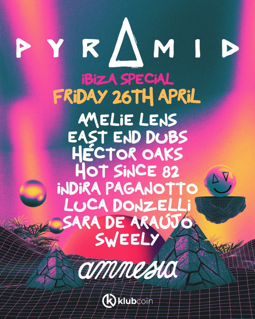 En la Main Room disfrutaremos de una habitual de Pyramid Special, la reina del techno, Amelie Lens vuelve a subirse a la cabina de Amnesia para cautivar con su pasión y sonido. También podremos deleitarnos con la impecable técnica de Héctor Oaks, un artista que es capaz de sacarle todo el partido al sonido del vinilo. Corazón y energía es lo que nos propone Indira Paganotto, una DJ que no para de crecer y que consigue manejar la pista de baile a su antojo. Y por último la sesión de uno de los miembros más fiables de la familia Pyramid, Luca Donzelli desplegará todo su talento en la sala más contundente de la isla.