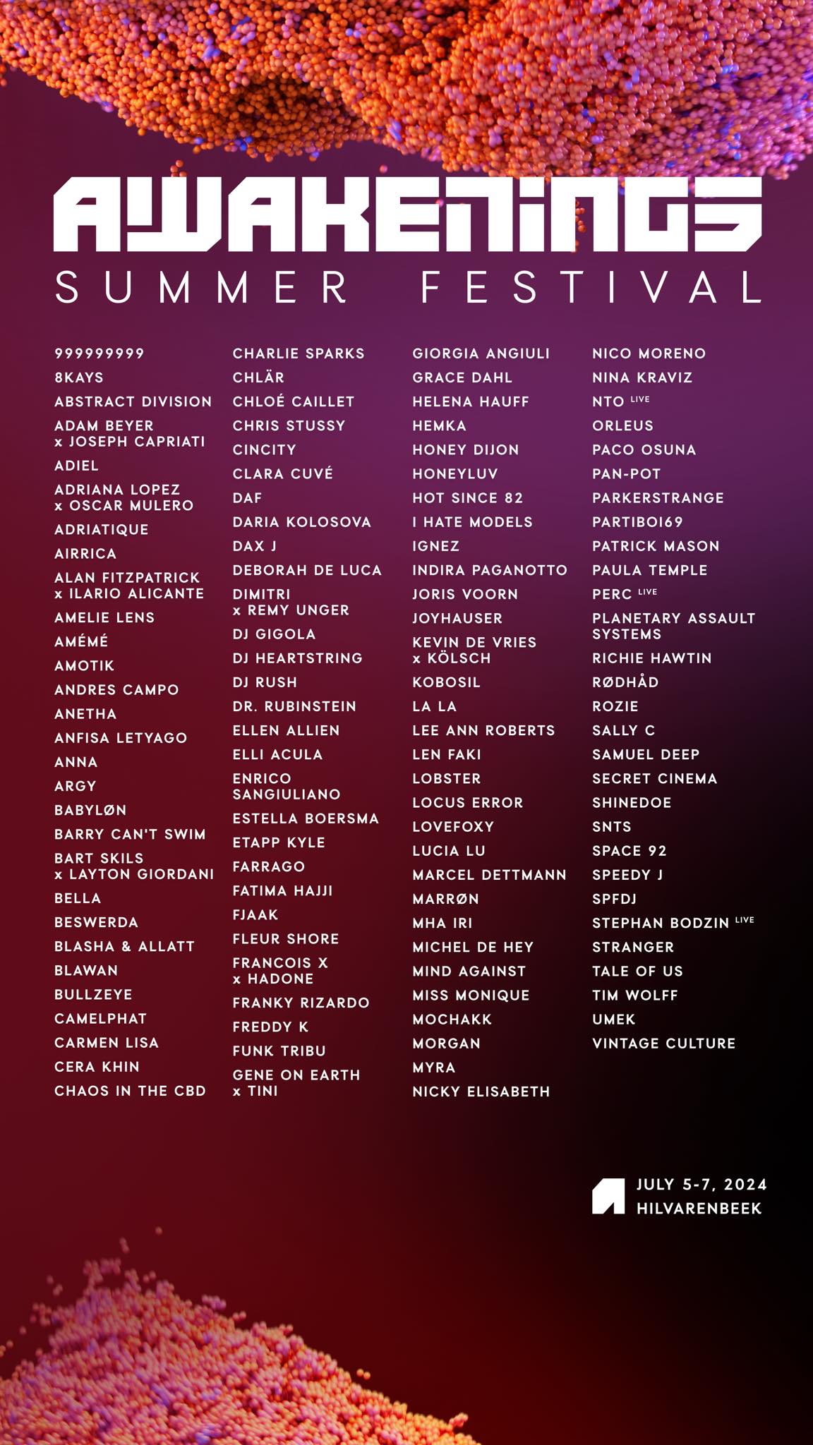 Con una variada y extensa propuesta, Awakenings volverá a ser el gran punto de reunión de la música Techno en el verano europeo. Recibiendo a artistas y aficionados de todas partes del mundo, con notoria presencia española año sí año también, el festival neerlandés ya perfila la siempre llamativa puesta en escena que presenta en vivo, viéndose acompañada por un sonido impoluto que es referencia para todos los festivales del mundo. ¡Os dejamos la programación al completo para que podáis echarle un ojo detenidamente!: