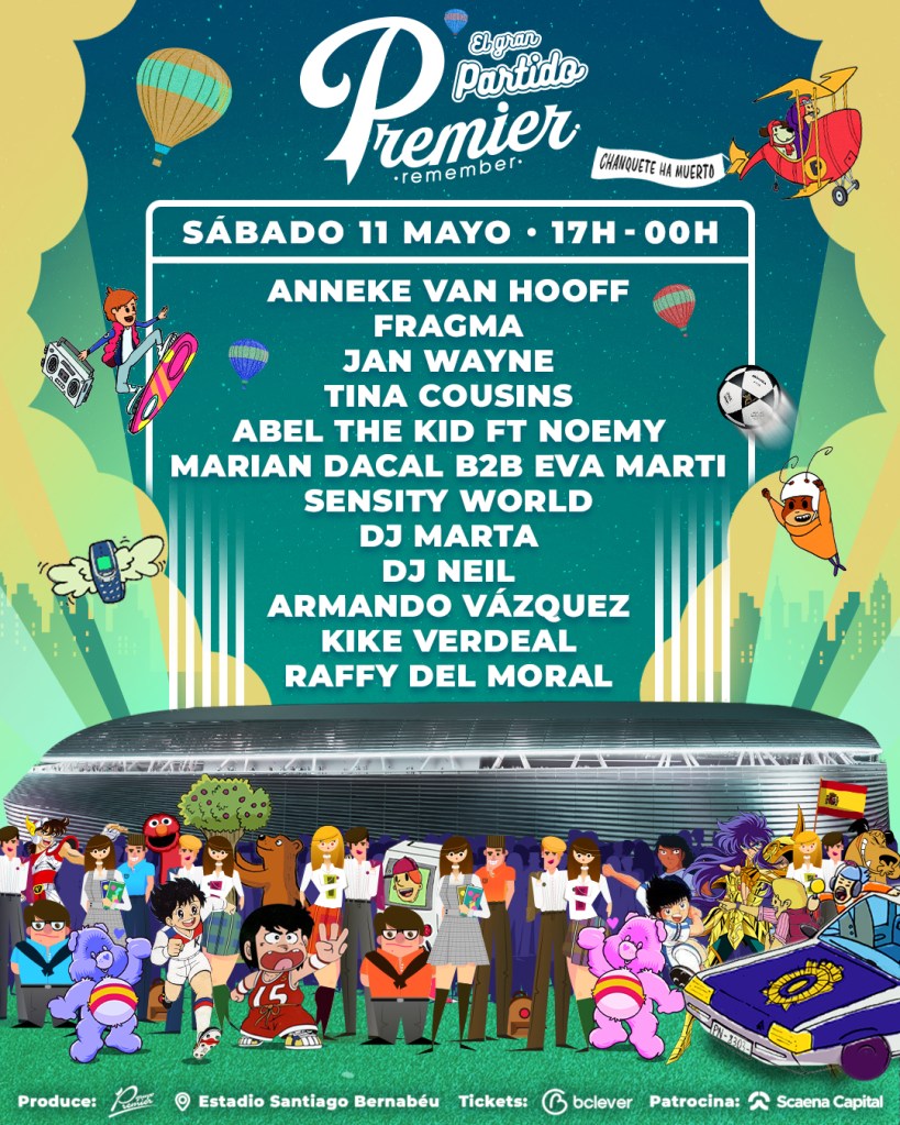El lineup de vértigo para este debut de Premier Remember en el Santiago Bernabéu es el más ambicioso de su historia, con presencia internacional con artistas como la vocalista Anneke Van Hooff, actuaciones en directo como el de la teutona Fragma, la cantante británica Tina Cousins o el también productor alemán Jan Wayne. El sonido remember tiene en la escena nacional grandes estrellas que tampoco podían faltar en este Premier de gran formato, con nombres que ofrecerán actuaciones exclusivas como el B2B de Marian Dacal y Eva Marti, o la actuación featuring de Noemy junto a Abel The Kid.