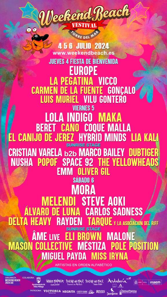 El malagueño WEEKENDBEACH FESTIVAL ha presentado en sociedad la propuesta completa diseñada para hacer bailar a sus fieles el próximo verano. Asentado como uno de los eventos socio-musicales más importantes del sur del país, el festival focalizado en Techno/Tech-House, Pop, Urban y Rock (con guiños a otros géneros como la Fusión o el Drum & Bass) ha presentado a los últimos artistas en sumarse al LineUp diseñado para los días 4, 5 y 6 de Julio.