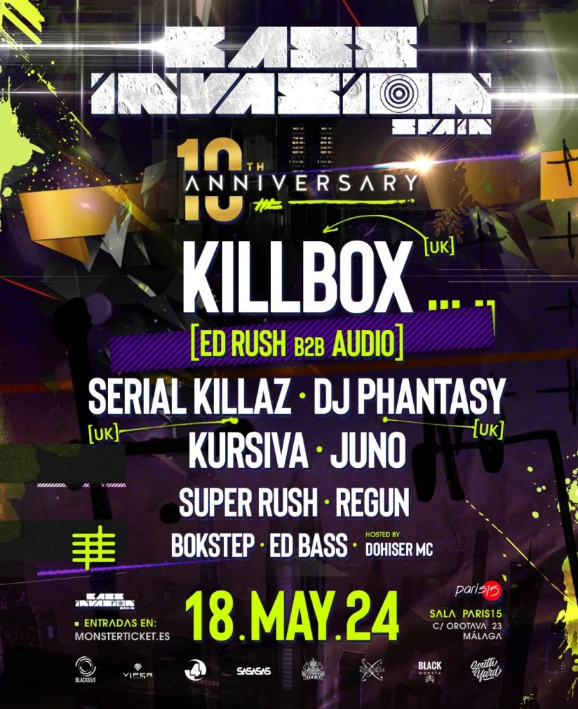 El sábado 18 de mayo, la sala PARIS 15 de Málaga será testigo de la locura y frenesí musical que desplegarán a los platos los grandes invitados a la velada. Encabezando el LineUp encontramos a la formación británica KILLBOX (compuesta por Ed Rush y Audio), quienes estarán resguardados por sus compatriotas SERIAL KILLAZ y DJ PHANTASY, dando forma a un tridente que asusta (en el mejor sentido de la palabra) y asombra. De esta manera, el Drum & Bass más agresivo y alocado tendrá rienda suelta entre aromas Neurofunk, Dark y Jungle, los cuáles quedan reforzados con un elenco nacional espectacular, compuesto por dos números 1 en España como KURSIVA y JUNO, así como por otros grandes djs afines al colectivo como REGUN, SUPER RUSH, BOKSTEP, ED BASS y el MC DOHISER.