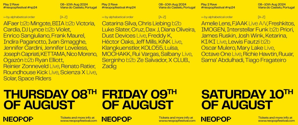 Uno de los grandes festivales Underground del sur de Europa ha completado el cartel de su próxima edición. NEOPOP volverá hacer que Portugal sea visto como el país idílico del Techno durante 3 jornadas musicales (8, 9 y 10 de agosto) que prometen vanguardia, aroma clásico, contundencia, elegancia y muy buen gusto musical. El festival celebrado en Viana Do Costelo ha rematado a lo grande un LineUp en el que ya destacaban figuras como Richie Hawtin, Jeff Mills, Amelie Lens, Nico Moreno o Mochakk entre otros.