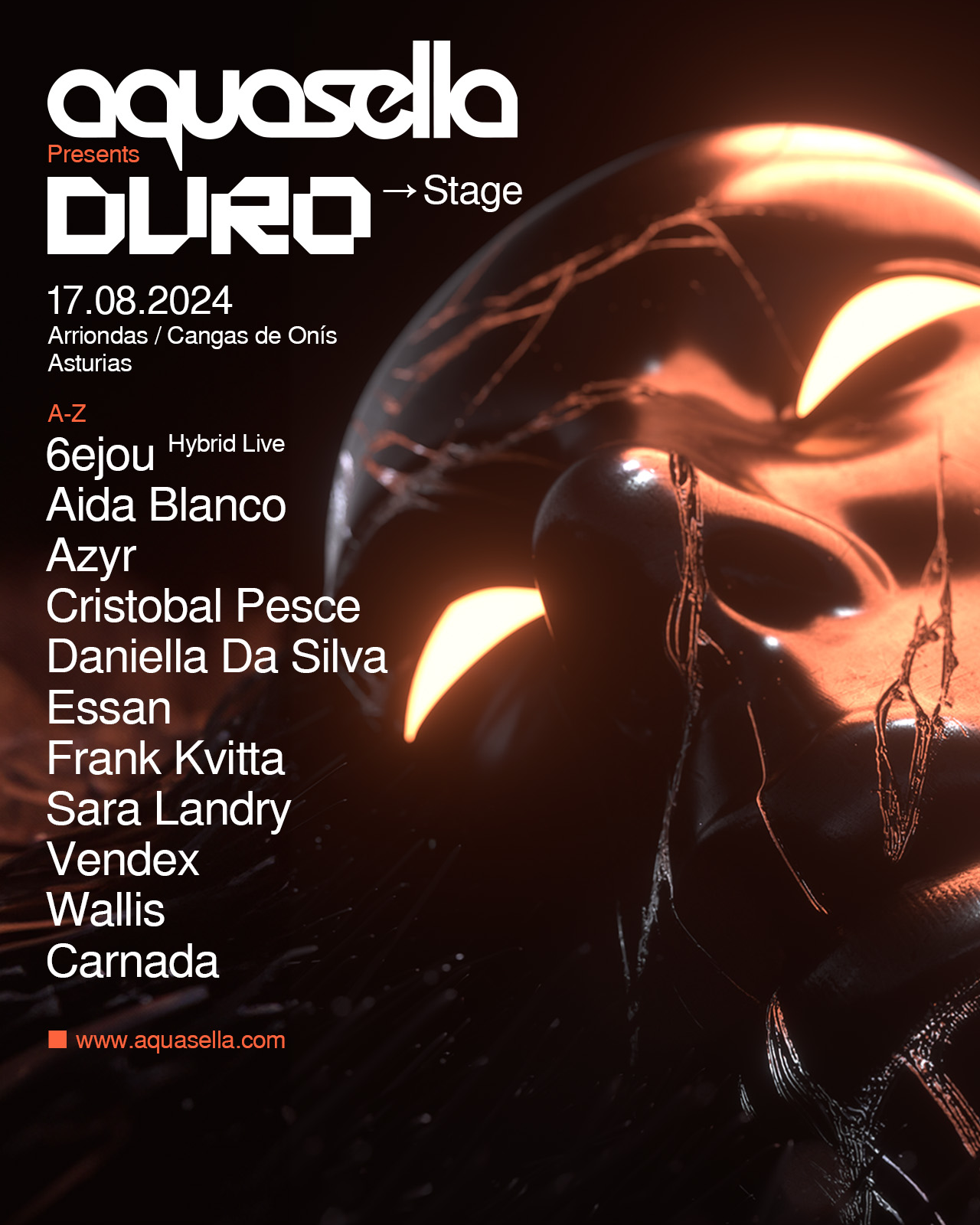 Aquasella sigue ofreciendo novedades de cara a su esperada 27ª edición. Uniendo fuerzas con una marca que ha irrumpido con mucha fuerza como es DURO, el festival asturiano se prepara para dar mucha guerra con los sonidos más agresivos y contundentes del género Techno actual. ¡Os dejamos todos los detalles del LineUp para que conozcáis todos los componentes de este escenario y del resto de la programación!: