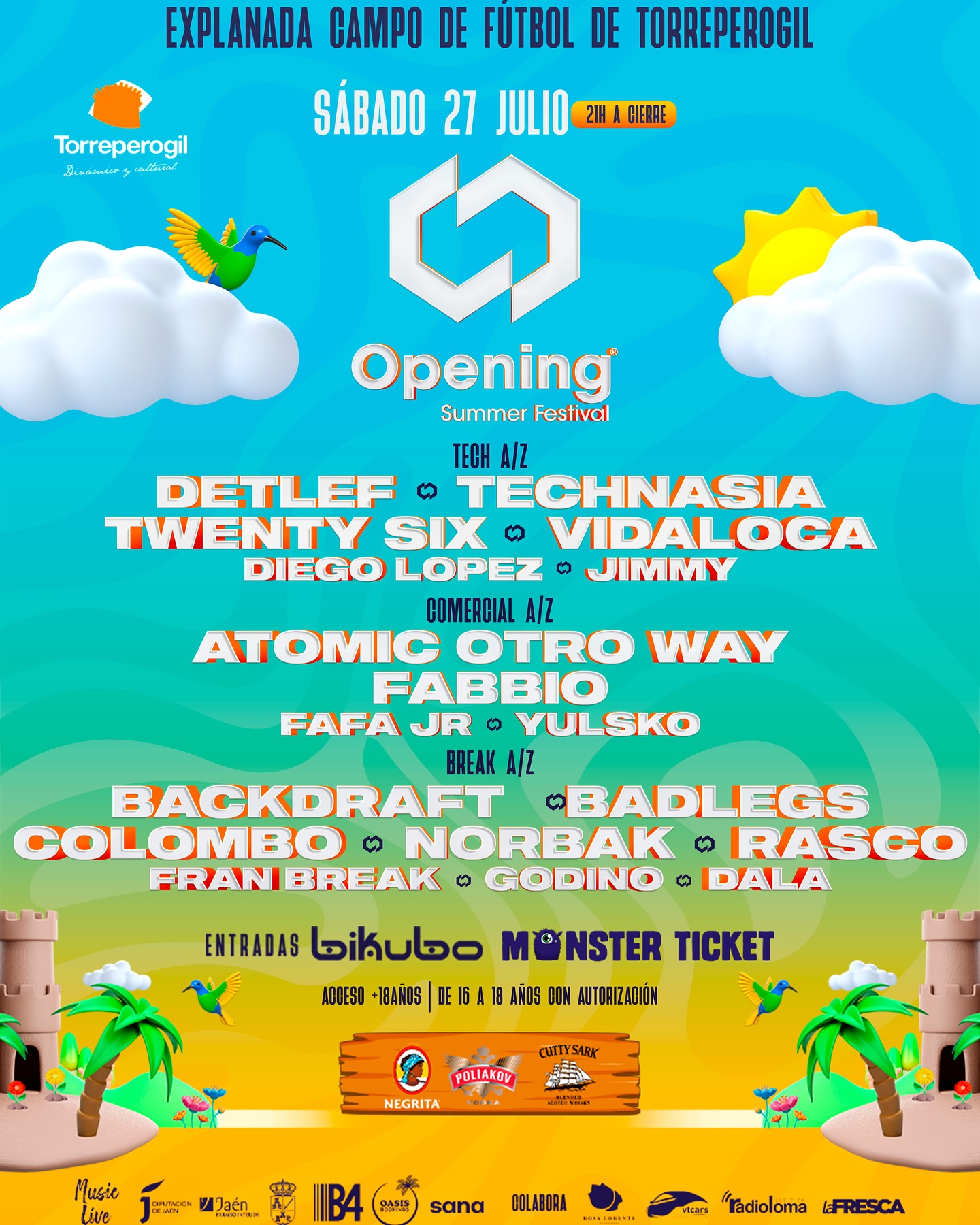 Tech-House, Latin-Urban y Breakbeat han sido citados para que el sábado 28 de Julio la localidad de Torreperogil (Jaén) viva una gran jornada musico-festiva con el público más joven. OPENING SUMMER FESTIVAL volverá a demostrar su potencial con una edición renovada que ha apostado por la inclusión de varias actuaciones de géneros urbanos, por la adición de un segundo escenario dedicado al Breakbeat y ha prolongado su fiel propuesta de Tech-House.