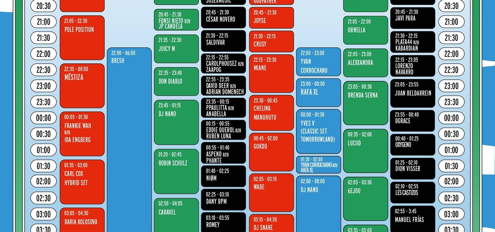 LineUp por avances: Gordo / Carl Cox / Dj Snake, Sub Zero Project, Shlomo… / Richie Hawtin, WADE, Morten, Juicy M… / Don Diablo, 999999999, Yves V, Chelina Manuhutu, Robin Schulz, Basswell… / Luciid, 6EJOU, ALT8, Oro Viejo by Dj Nano, BRESH… / Cierre de cartel, Les Castizos, Fonsi b2b JP Candela, Shake Coconut…