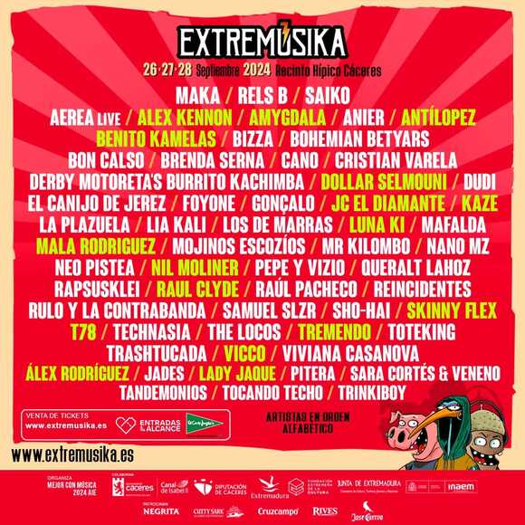 La variada propuesta del festival EXTREMUSIKA ha sido desvelada al completo de cara a su próxima edición. El festival extremeño regresará a Cáceres los días 26, 27 y 28 de septiembre, haciendo que la música en vivo sea protagonista entre variopintos ritmos Urbanos, Latinos, Electrónicos, Pop, Rock, Techno…