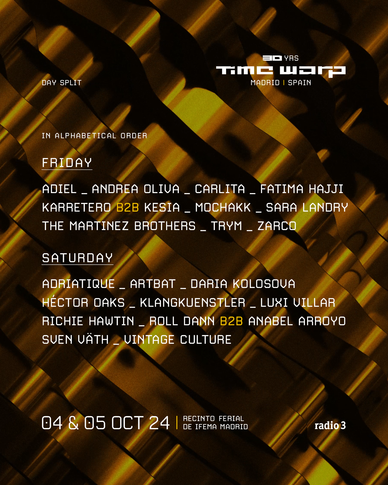 Con actuaciones muy destacadas y con la versatilidad de géneros ofrecidos a lo largo de la programación, el LineUp de Time Warp reluce con grandeza presagiando grandes cosas para su edición debut. Madrid puede presumir de un evento de primer nivel, cuyo calibre hará efecto llamada en aficionados procedentes de todas partes de la Península Ibérica. ¡Os dejamos el cartel completo dividido por días de actuación para que podáis conocer toda la propuesta musical!: