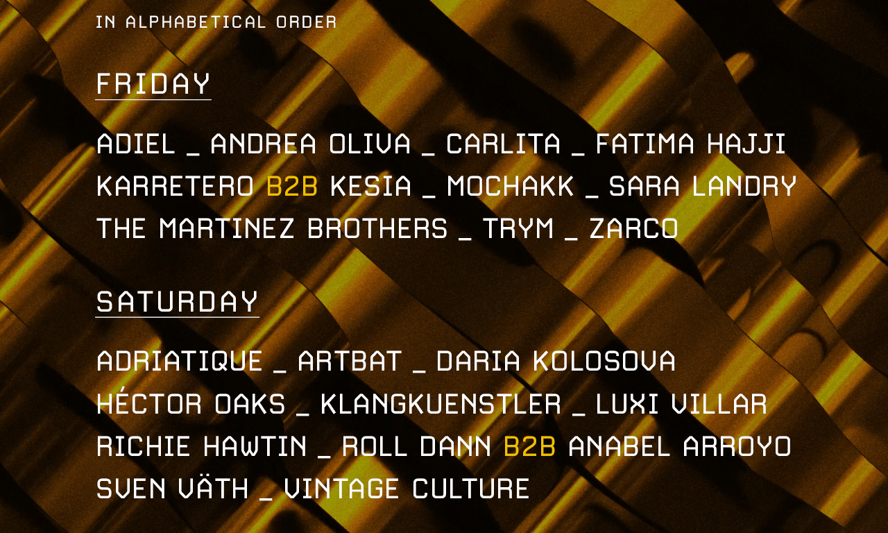 En sonidos totalmente opuestos y respondiendo a la tendencia actual más pegadiza, la contundencia se abre paso haciendo que Schranz y Hard Techno imperen de manera firme gracias a los dj sets del alemán KLANGKUENSTLER, el francés TRYM, la estadounidense SARA LANDRY y los españoles FATIMA HAJJI y HEKTOR OAKS. En el temple y delicadeza de los sonidos armónicos, el festival apuesta de manera seria por el Melodic Techno y el Deep House para su segunda jornada. Ahí brillarán referentes como el brasileño VINTAGE CULTURE, los suizos ADRIATIQUE o los ucranianos ARTBAT y DARIA KOLOSOVA, siendo grandes apuestas del festival.
