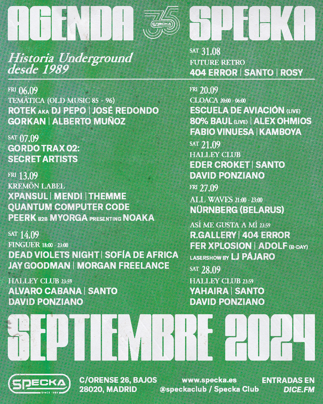 Specka Madrid lleva desde 1989 siendo el gran referente del underground en la capital, un club íntimo y enriquecedor en el que no faltan los sonidos alternativos, de techno, house, ebm, electro, dark disco, IDM, post-punk y todo tipo de propuestas que no encontrarás en los saturados espacios mainstream. Si buscas ser diferente, aportar tu granito de arena a la cultura clubbing con mayúsculas, si quieres disfrutar de una calidad de sonido impecable gracias a la apuesta por Funktion One, te recomendamos que visites Specka este mes de septiembre y disfrutes de cualquiera de estos eventos.