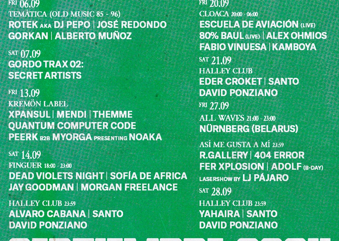 El Sábado 14 de septiembre en sesión de tarde podremos adentrarnos en la propuesta de Finguer. Liderada por los héroes locales Morgan Freelance, Sofía de África y Jay Goodman, Finguer pretende diferenciarse con un estilo propio, apostando por la calidad musical y el eclecticismo como señas de identidad. La sesión inaugural de Finguer contará con la presencia de la artista francesa Dead Violets Night, conocida por su potente mezcla de techno industrial, EBM y electro.