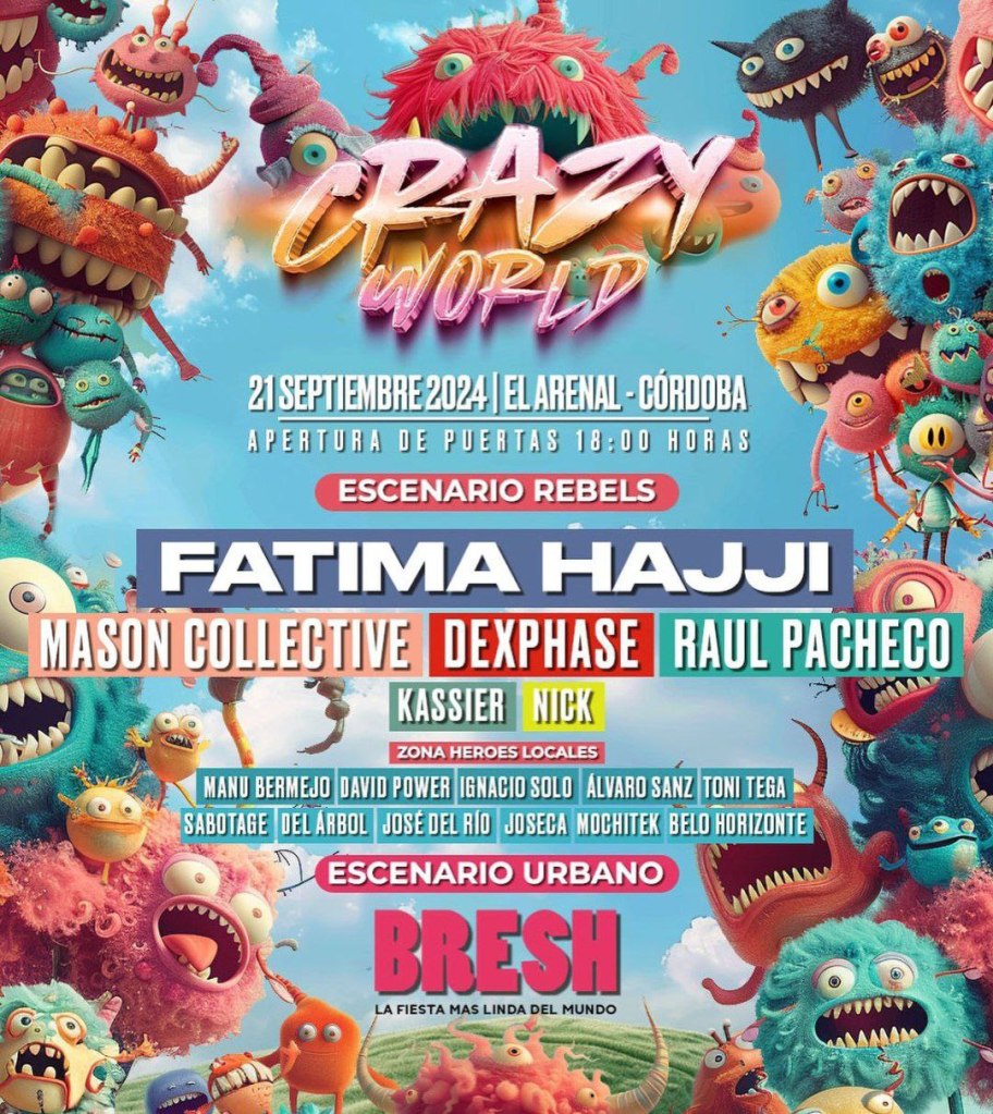 El mejor sonido electrónico cabalgará a lo grande gracias a la llegada de REBELS. La afamada marca andaluza hará que el Underground viaje desde aromas Tech-House hasta Hard-Techno gracias a visitas muy esperadas como las de la diva del Hard FATIMA HAJJI, el trío británico MASON COLLECTIVE, el fundador de Blackworks DEXPHASE o el siempre infalible RAÚL PACHECO. El escenario Rebels contará también con la presencia de KASSIER y NICK, siendo una apuesta por el sonido regional que se ve extendida a la ZONA DE HÉROES LOCALES, donde el Techno y el Tech-House sonará de lo lindo durante toda la jornada gracias a las actuaciones de Manu Bermejo, David Power, Ignacio Solo, Álvaro Sanz, Toni Tega, Sabotage, Del Árbol, José del Río, Joseca, Mochitek y Belo Horizonte. Por su parte, la música Urbana y Latina tendrá cabida en el escenario BRESH, donde ‘la fiesta más linda del mundo’ (con LineUp sorpresa) llenará de ritmo y baile el Arenal de Córdoba haciendo que Crazy World cuente con una propuesta pensada para todos los públicos.