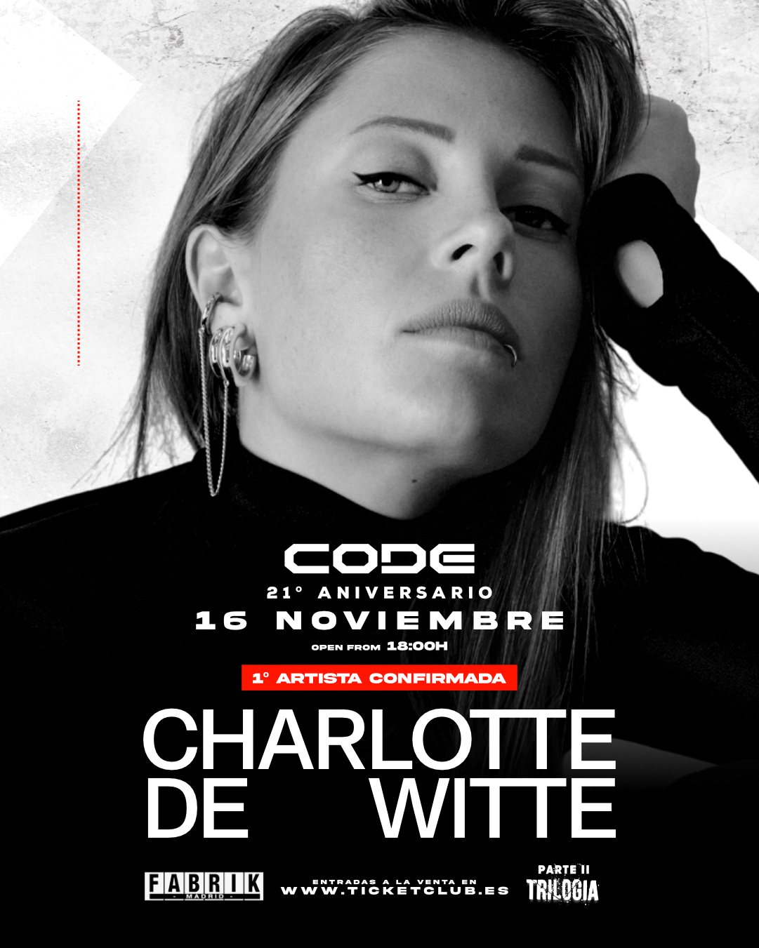 La belga CHARLOTTE DE WITTE será la gran invitada en esta especial celebración el la discoteca de Humanes de Madrid. Haciendo su regreso a Fabrik por todo lo alto, la talentosa referente hará que sus temas más vibrantes hagan retumbar los cimientos de la sala bajo el característico estilo de su sello KNTXT. Además, y pese a que la belga bien merece por sí sola la entrada para la velada, Charlotte estará muy bien acompañada por otros artistas internacionales y djs habituales a la marca CODE, que irán siendo anunciados en las próximas semanas.
