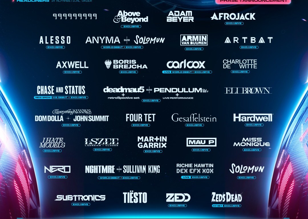 Los grandes iconos de la escena EDM no faltarán al 25º Aniversario del Festival. MARTIN GARRIX, HARDWELL, TIËSTO, ARMIN VAN BUUREN, AFROJACK, ZEDD, ALESSO o AXWELL (entre otros) han inaugurado el cartel postulando la vigencia, legado e importancia de una variedad de géneros mainstream que siempre han estado en la cima a nivel global. Por parte del Techno, la apuesta de años previos no sólo se mantiene, si no que aumenta contando con números 1 de estos últimos años como CHARLOTTE DE WITTE, ADAM BEYER, BORIS BREJCHA, I HATE MODELS, ELI BROWN o 999999999; así como una serie de actuaciones exclusivas que han acaparado la atención de los aficionados: RICHIE HAWTIN DEX EFX XOX y CARL COX Live.