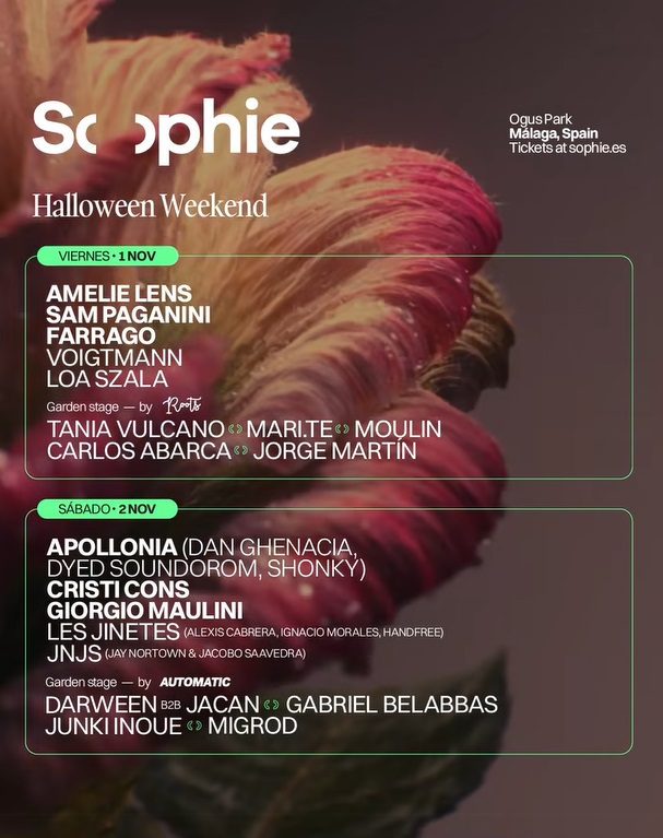 Si añadimos el contexto de festividad de Halloween, la cita gana en creces. Es por ello que SOPHIE haya querido apostar de forma firme por la mejor música electrónica del momento en una cita muy señalada que hará las delicias del público más exigente y aficionado a la más alta exquisitez. ¡Os dejamos con el LineUp completo y su reparto por días y escenarios!: