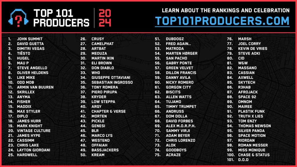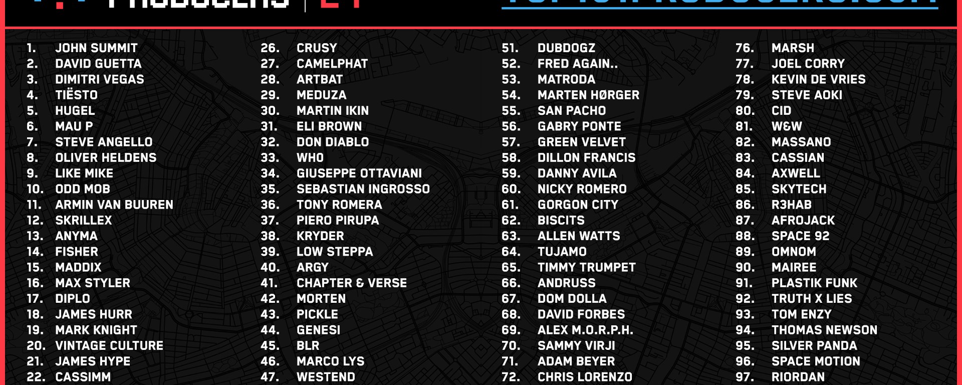 De nuevo la web 1001 Tracklists ha sido centro de todas las miradas al desvelar su top anual de productores a nivel mundial. Usando su amplia base de datos como referencia, la web contabiliza el número de veces que han aparecido canciones de un artista en los djs set registrados en el último año, permitiendo saber qué productores han tenido mayor impacto en la escena durante los últimos 12 meses. Tras la victoria de David Guetta en 2023 y 2022, el galo ha pasado al segundo puesto relegando la victoria a un artista completamente al alza.