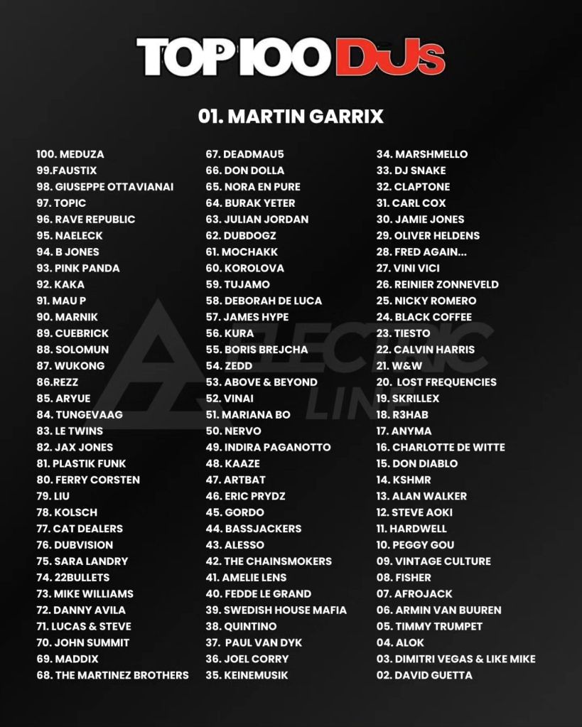 El joven neerlandés MARTIN GARRIX ha tomado el relevo de David Guetta (ganador en 2023) para volver a ser el número 1 del mundo. De este modo, el creador de hits de 2024 como Wherever You Are, Carry You, Empty o Smile supera al francés e iguala a Armin van Buuren como artista con mayor número de victorias en el ranking, siendo ya un total de 5 (2016, 2017, 2018, 2022 y 2024). El ya mencionado GUETTA con el segundo puesto y DIMITRI VEGAS & LIKE MIKE en el tercero (desde 2024 sólo han faltado en 2021 a su cita con el podio), completan el tridente que impera y gobierna sobre el Top 100 Djs de 2024.