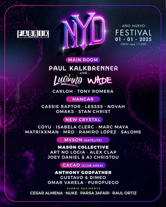 FABRIK quiere que su 2025 empiece de la mejor forma posible. Por ello, la mayor discoteca de MADRID y uno de los puntos referencia del clubbing mundial, ha presentado su NYD, un FESTIVAL DE AÑO NUEVO en el que los aficionados se citarán para bailar junto a grandes referentes de la música Underground. Desde las 17:00 de la tarde hasta altas horas de la madrugada del miércoles 1 de enero, los fans podrán disfrutar de 5 áreas llenas de ritmo y buen ambiente.