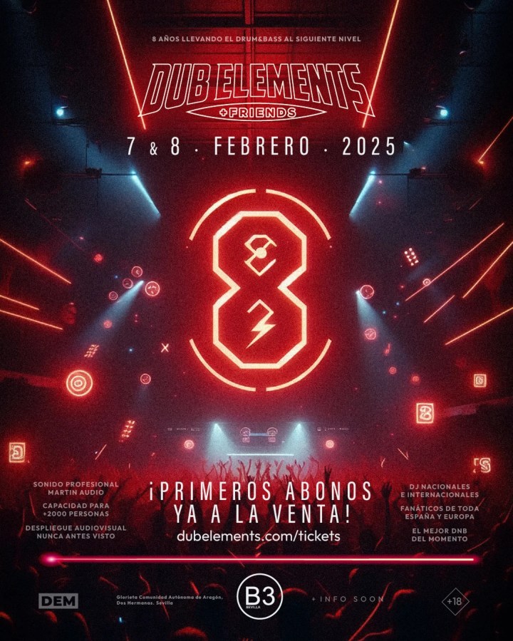 El dúo español DUB ELEMENTS han presentado la fecha de celebración del 8º Aniversario de su fiesta estrella. DUB ELEMENTS & FRIENDS celebrará su octavo cumpleaños en su lugar de costumbre, la Discoteca B3 de Dos Hermanas (Sevilla), reuniendo a grandes headliners internacionales, invitados nacionales de lujo y a los aficionados más fieles del sonido Drum & Bass en España.