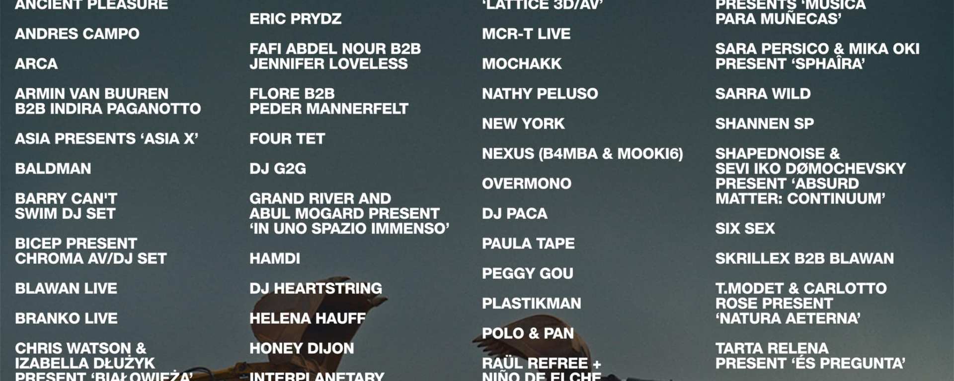 La música electrónica cabalgará con gusto sobrepasando géneros, esencias e influencias de todo tipo. El sonido clásico no faltará, destacando la pureza sonora del Progressive del sueco ERIC PRYDZ o el hipnótico sonido Minimal-Techno del canadiense PLASTIKMAN (aka Richie Hawtin). No defraudarán tampoco esencias más vanguardistas como el sonido Melodic Techno / Deep House del brasileño VINTAGE CULTURE, el imparable sonido Tech de su compatriota MOCHAKK; el House más fiestero de la surcoreana PEGGY GOU; el selecto e hipnótico ‘House’ del británico FOUR TET; o las tendencias elitistas más alternativas y experimentales con referentes como el dúo norirlandés BICEP (con su Chroma AV/DJ Set Show) o los galeses OVERMONO.