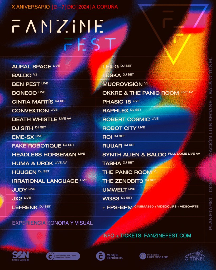 Ya ha llegado el momento de disfrutar de una nueva edición del Fanzine Fest, una edición muy especial ya que celebra su décimo aniversario. En esta ocasión el festival redobla su propuesta y su esfuerzo para convertir la ciudad de A Coruña en el epicentro de la cultura electrónica del 2 al 7 de diciembre en la Casa de las Ciencias, Domus, Fundación Luis Seoane x Son Estrella Galicia y Sala O Tunel.