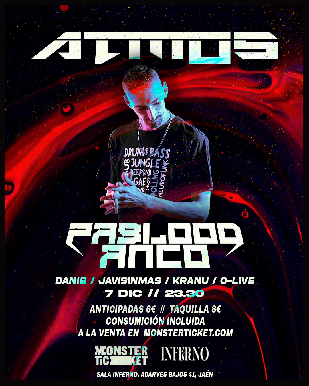 Jaén sigue respirando a DRUM AND BASS gracias a la fantástica apuesta del colectivo ATMOS. Los jiennenses ya tienen lista una nueva velada para este sábado 7 de Diciembre, en la que los aficionados disfrutarán de su género musical favorito al son que marquen los djs del colectivo, así como un invitado muy especial.